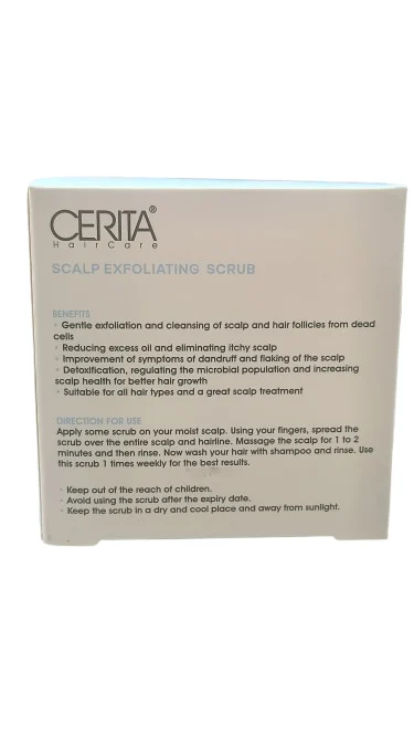 اسکراب کف سر سریتا یک لایه برداری فیزیکی و شیمیایی است که با لایه برداری ملایم خود باعث از بین رفتن پوست های مرده ، آلودگی ها و چربی های اضافه پوست سر می شود و در نتیجه باعث پاکسازی عمیق پوست سر ، کاهش شوره و پوسته ریزی ، کنترل چربی پوست سر و  تقویت موها می شود.